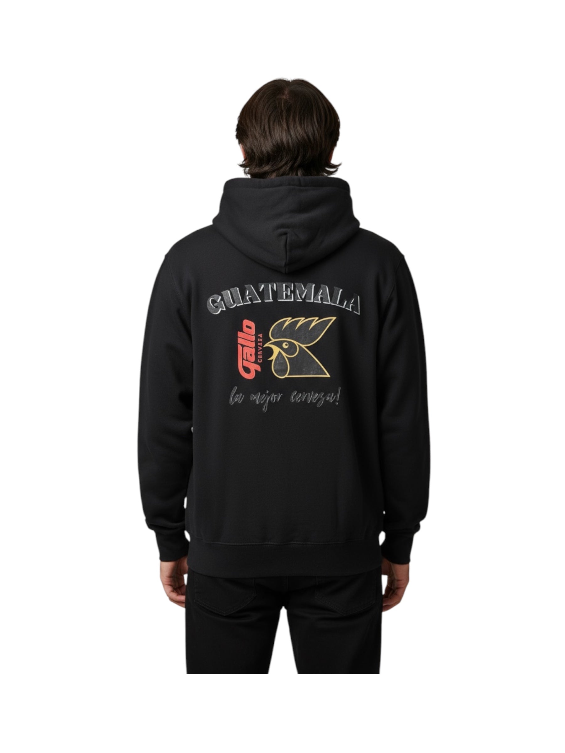 Unisex Fleece hooded Sweatshirt Large Black color costmized with Guatemalan beer Gallo Logo Animation on the back